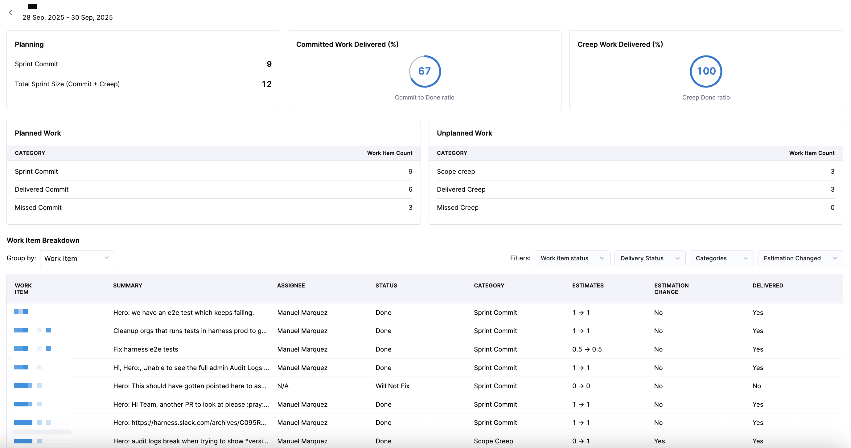 | Categories | Sprint Commit, Scope Creep | Filter by the type of work relative to the sprint plan. |