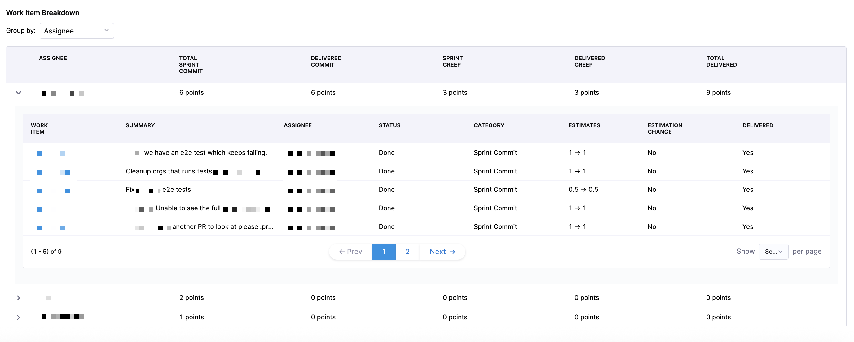 In addition to work item-level drilldown, you can also evaluate how work is distributed across the engineering team using assignee-based analysis. To see assignees displayed per sprint, select Assignee in the Group by dropdown menu.