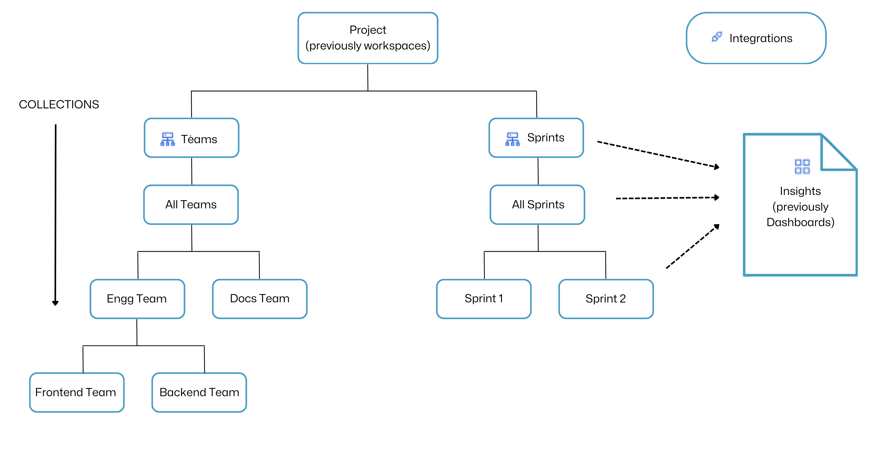 Inheritance flows down the Collection levels. For example, Collection categories and Collections inherit SEI integrations from the associated Harness project, and child Collections inherit Insights associations from their ancestor Collections. For more information about the relationship between projects, Collection categories, and Collections, go to Collection hierarchies.