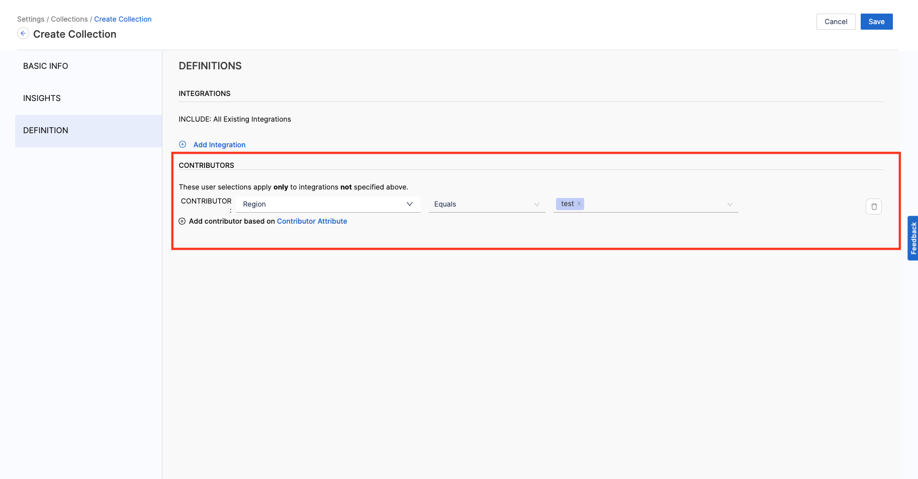 - Add the Integration Filters to determine the criteria to associate Contributors with the Collection.