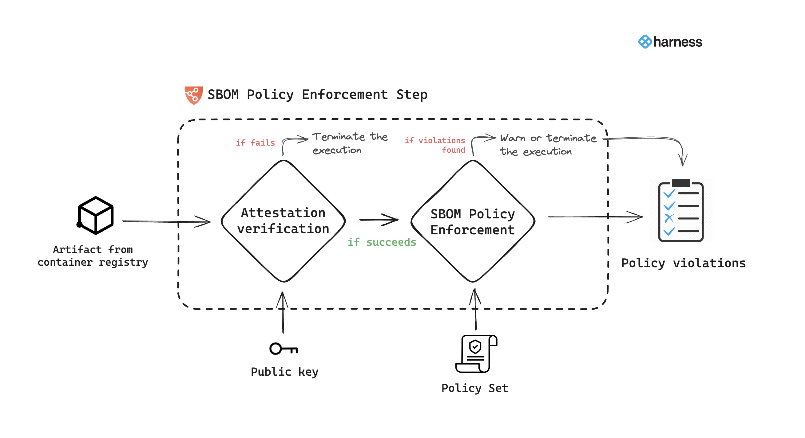 The Harness SCS module enables you to create these rules as policies that align with your organization's security regulations and legal compliance requirements. These policies can then be enforced on SBOMs. This entire process is facilitated through the SBOM Policy Enforcement step.