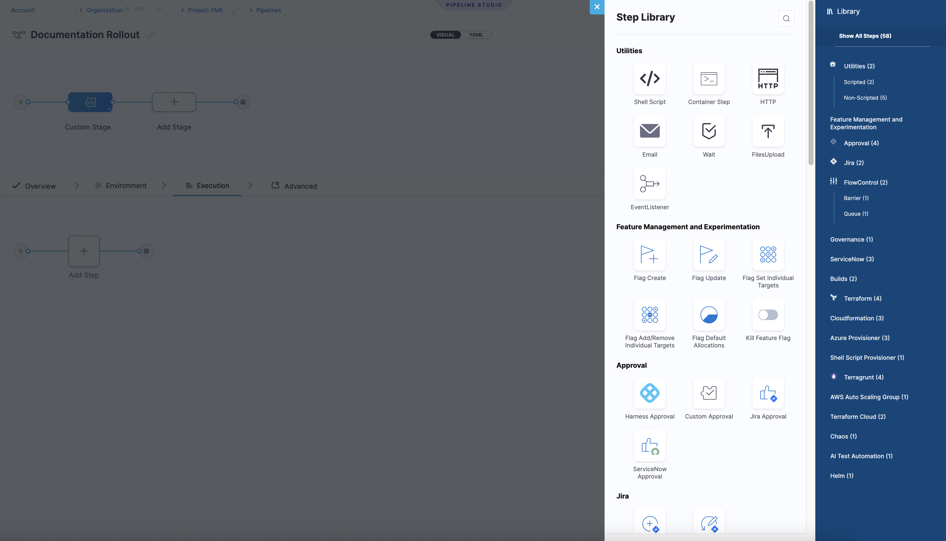 This release includes 14 steps, covering full flag lifecycle management, targeting capabilities, traffic allocation, and advanced patch operations, which are available under Feature Management & Experimentation in the Harness pipeline step library:
