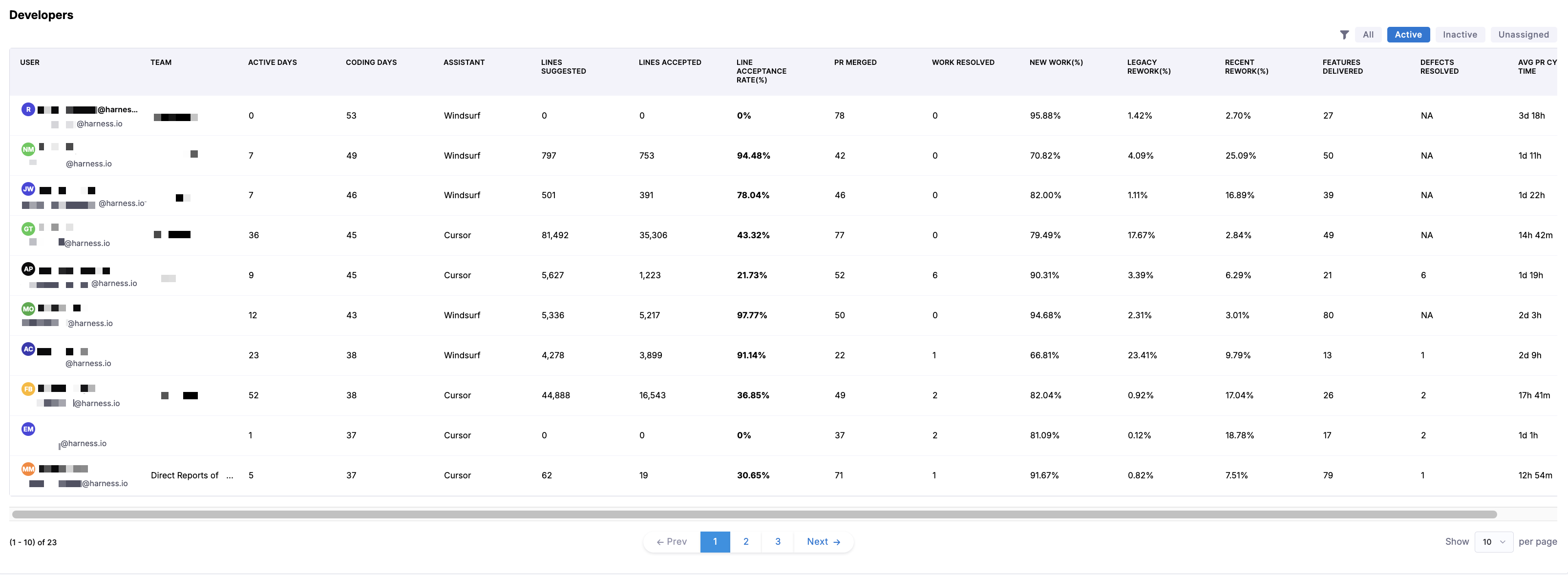 - Drill into individual developer metrics to identify usage patterns, productivity gains, and quality tradeoffs across assistants