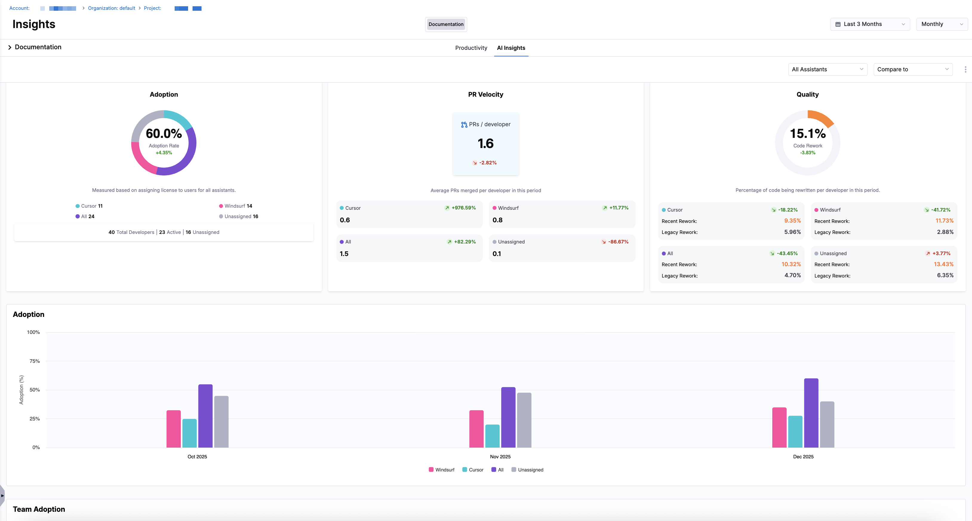 - Compare adoption trends to Productivity metrics such as PR Velocity Per Developer and PR Cycle Time