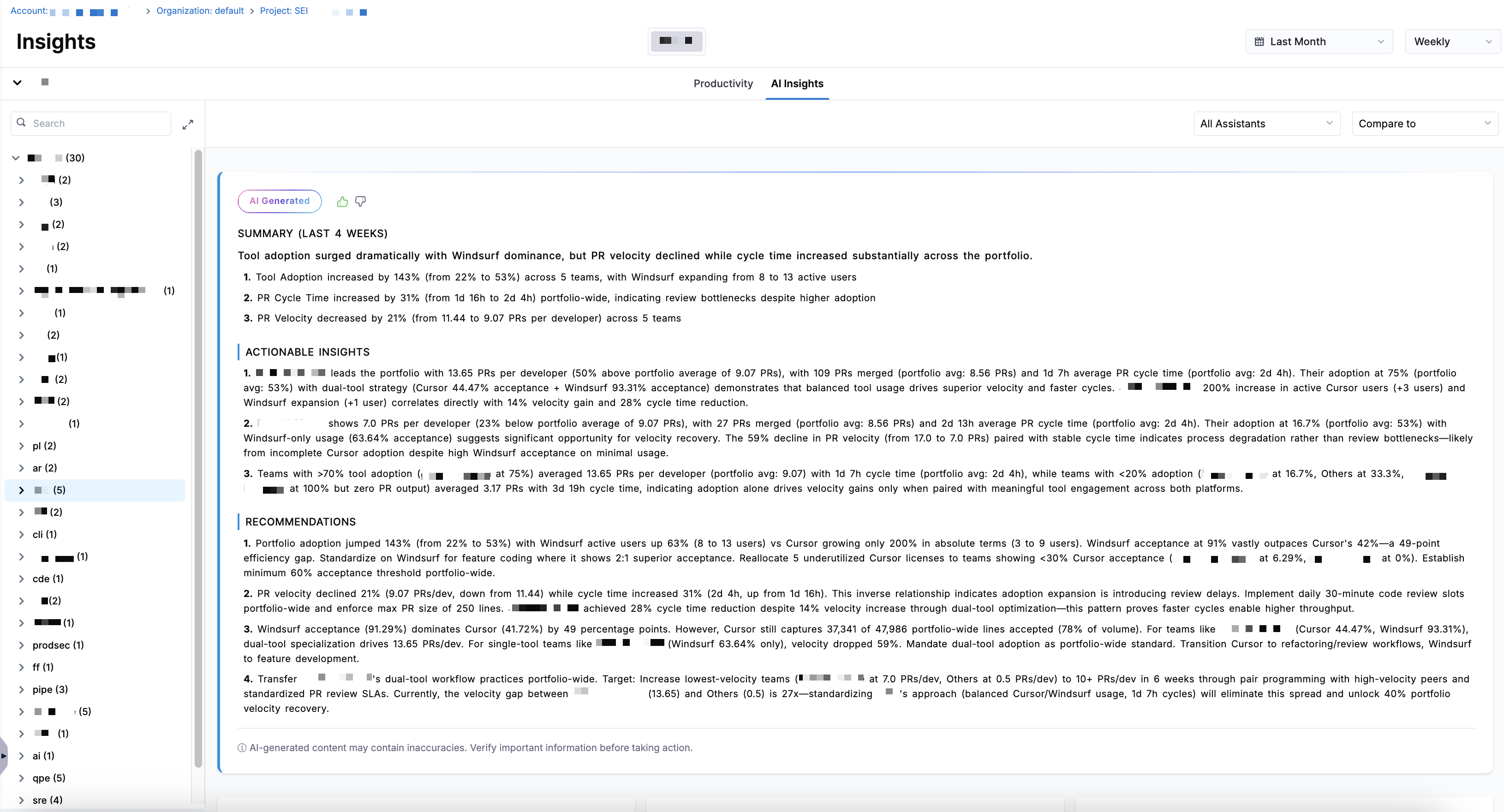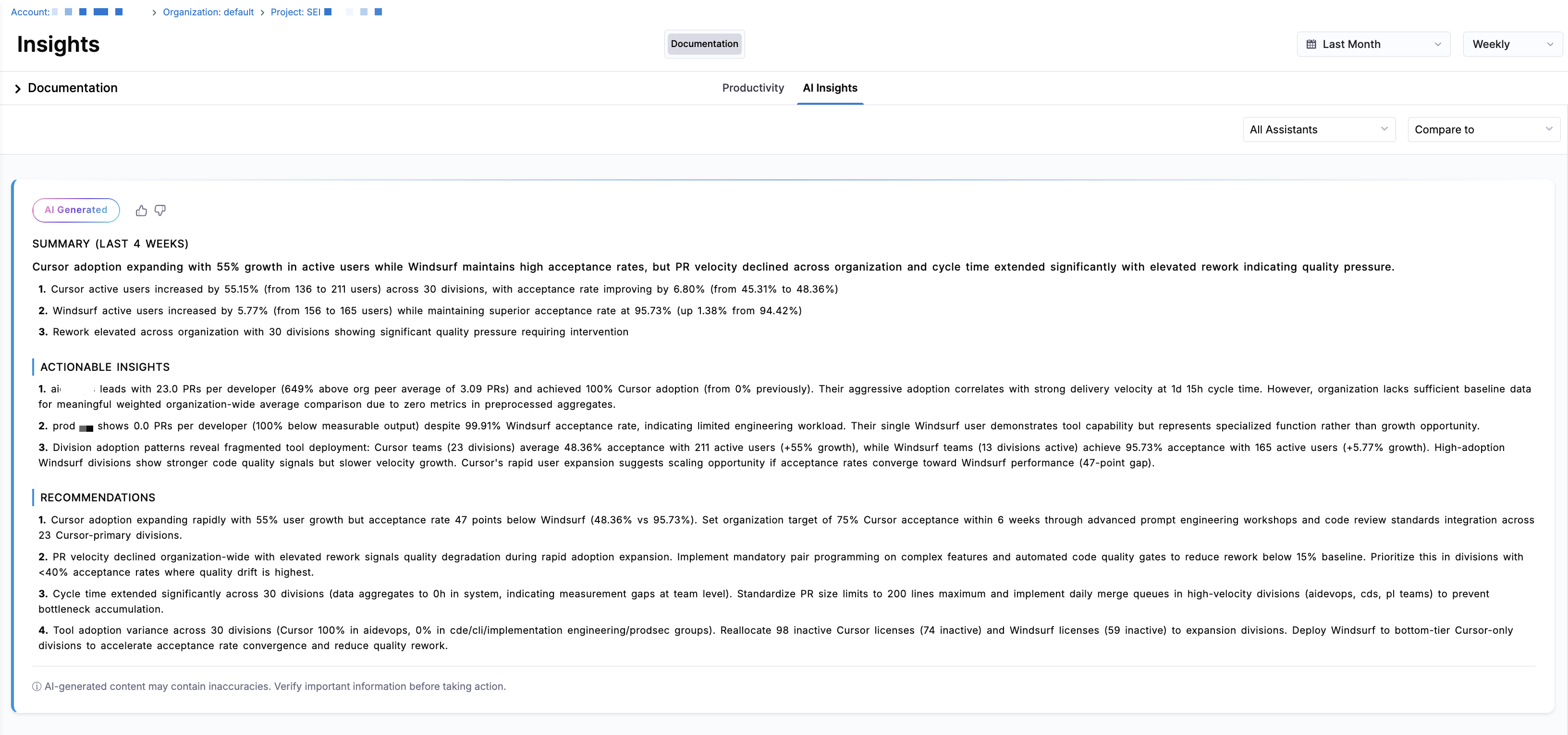 - At the organization level, AI summaries surface portfolio-wide trends such adoption shifts, acceptance rate gaps between AI assistants, changes in PR velocity and cycle time, and elevated code rework signals. Recommendations focus on strategic actions like standardizing tool usage, reallocating licenses, and addressing bottlenecks in code review workflows.