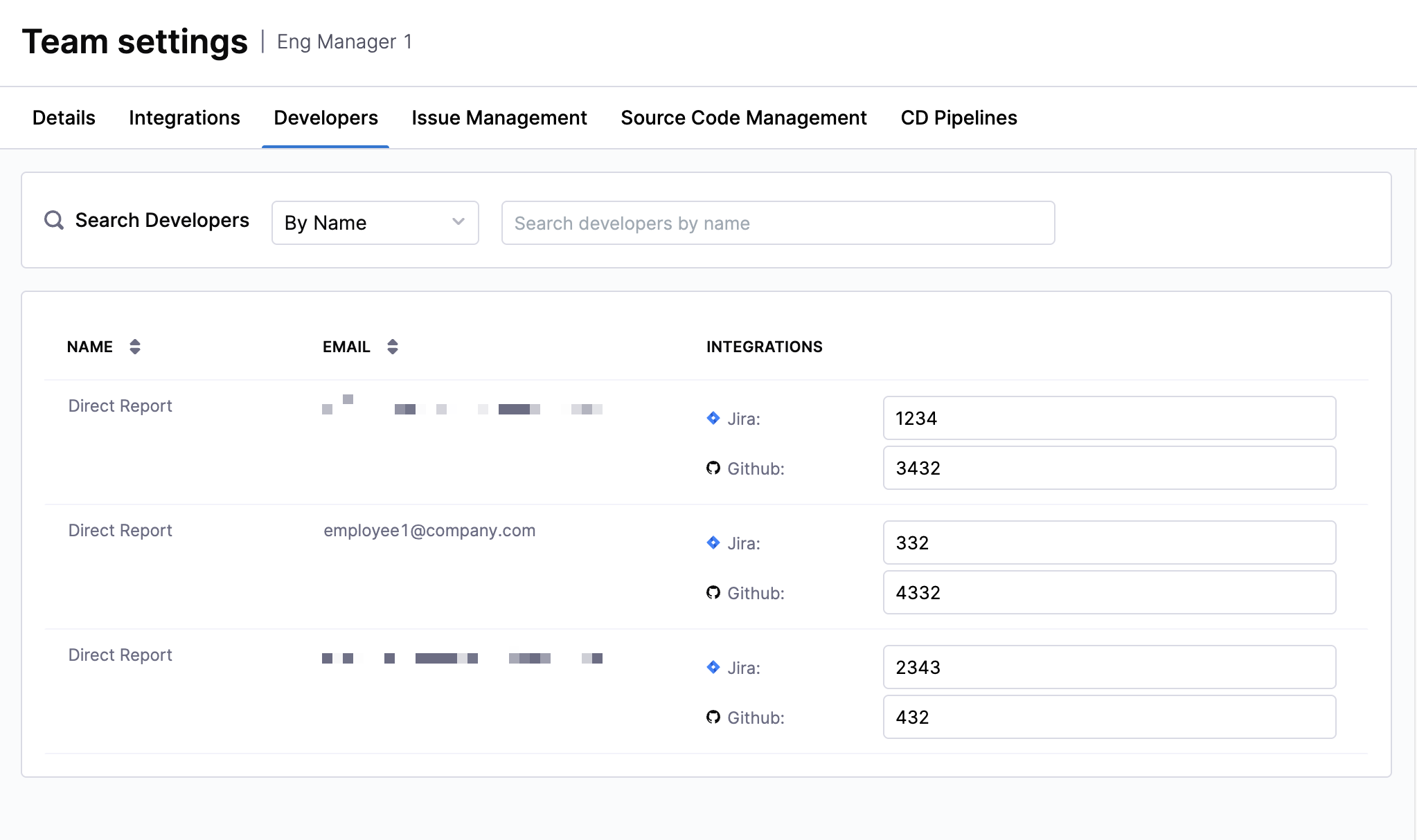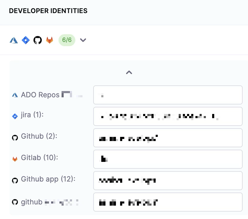 When multiple SCM integrations are configured, a single developer may have several identities. To ensure contributions from all repositories are correctly attributed, the Developers tab displays all linked developer identifiers per SCM integration.