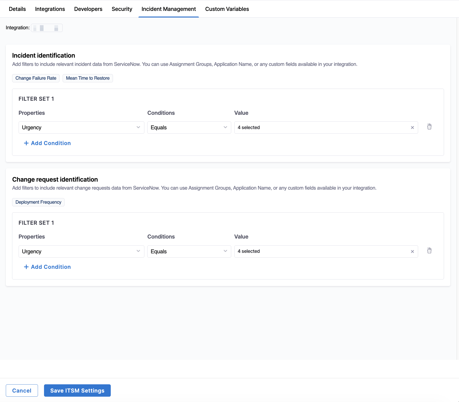 After selecting a ServiceNow integration on the Integrations tab in Team Settings, you can refine how ServiceNow data is mapped to Deployment Frequency, Change Failure Rate, and Mean Time to Restore (MTTR) by creating filter sets on the Incident Management tab. Each metric supports drilldowns into individual ServiceNow change requests and incidents on the Efficiency Insights dashboard, providing visibility into the underlying records.