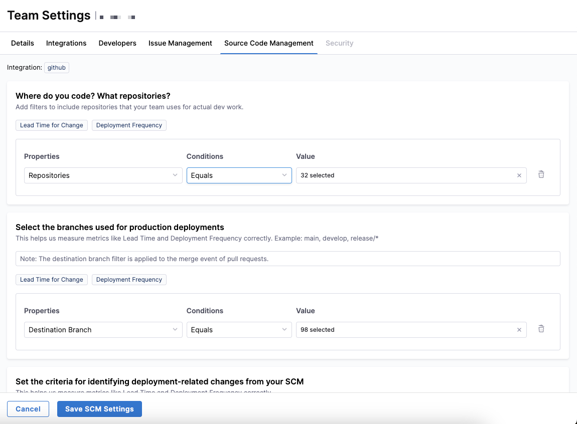 SEI 2.0 now supports selecting multiple source code management (SCM) integrations per team on the Integrations tab in Team Settings. This enables more accurate insights and metrics across all repositories your team contributes to.