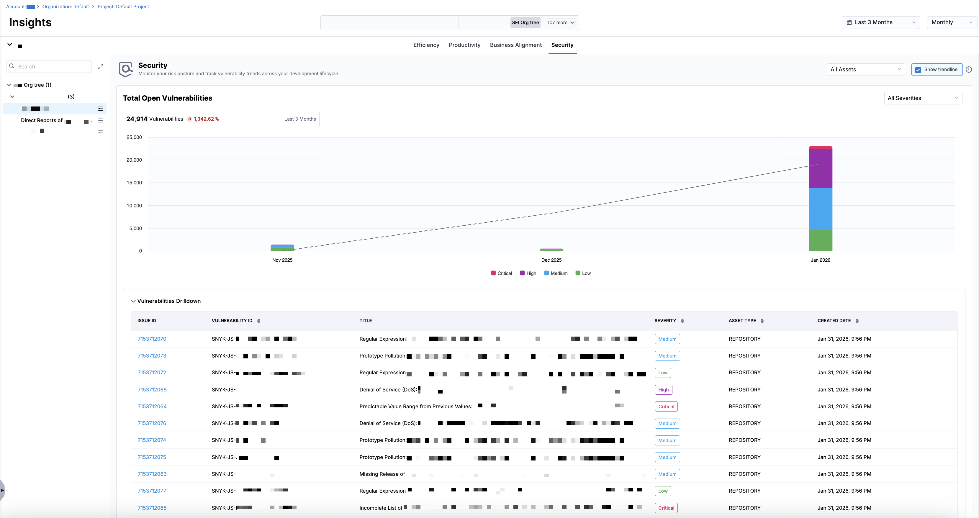 Security Insights is in beta for SEI 2.0, introducing vulnerability and code quality analytics alongside existing DORA, Productivity, and Business Alignment metrics. Security Insights is powered by the ArmorCode integration, which ingests Application Security Posture Management (ASPM) data from your security toolchain into Harness SEI, and provides visibility into open vulnerabilities.