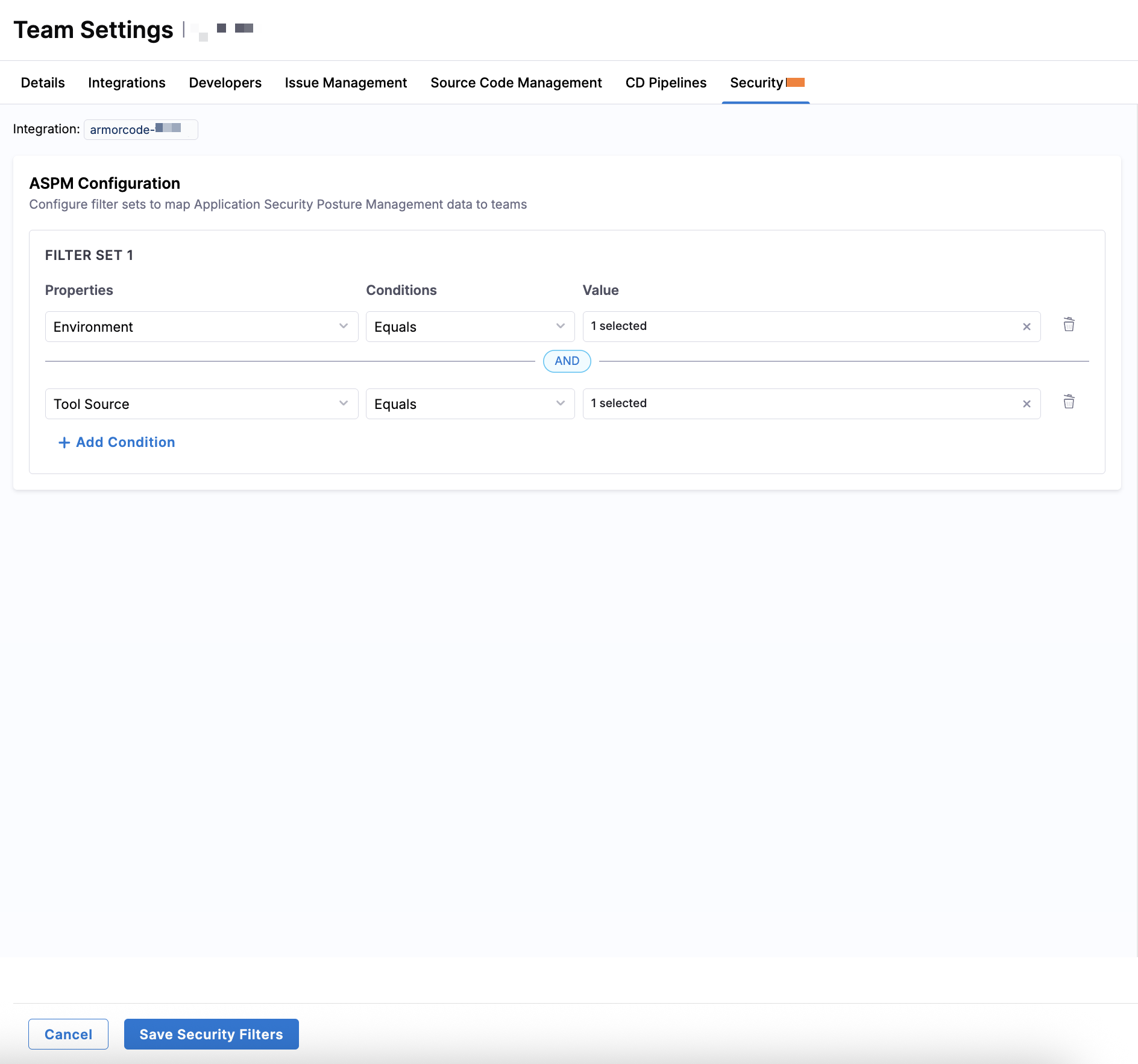 Once ArmorCode is connected, you can configure how security data is attributed across your organization and teams. Use the Integrations tab in Team Settings to select which security integrations apply to each team, and define filter sets on the Security tab in Team Settings to scope ASPM data to teams.