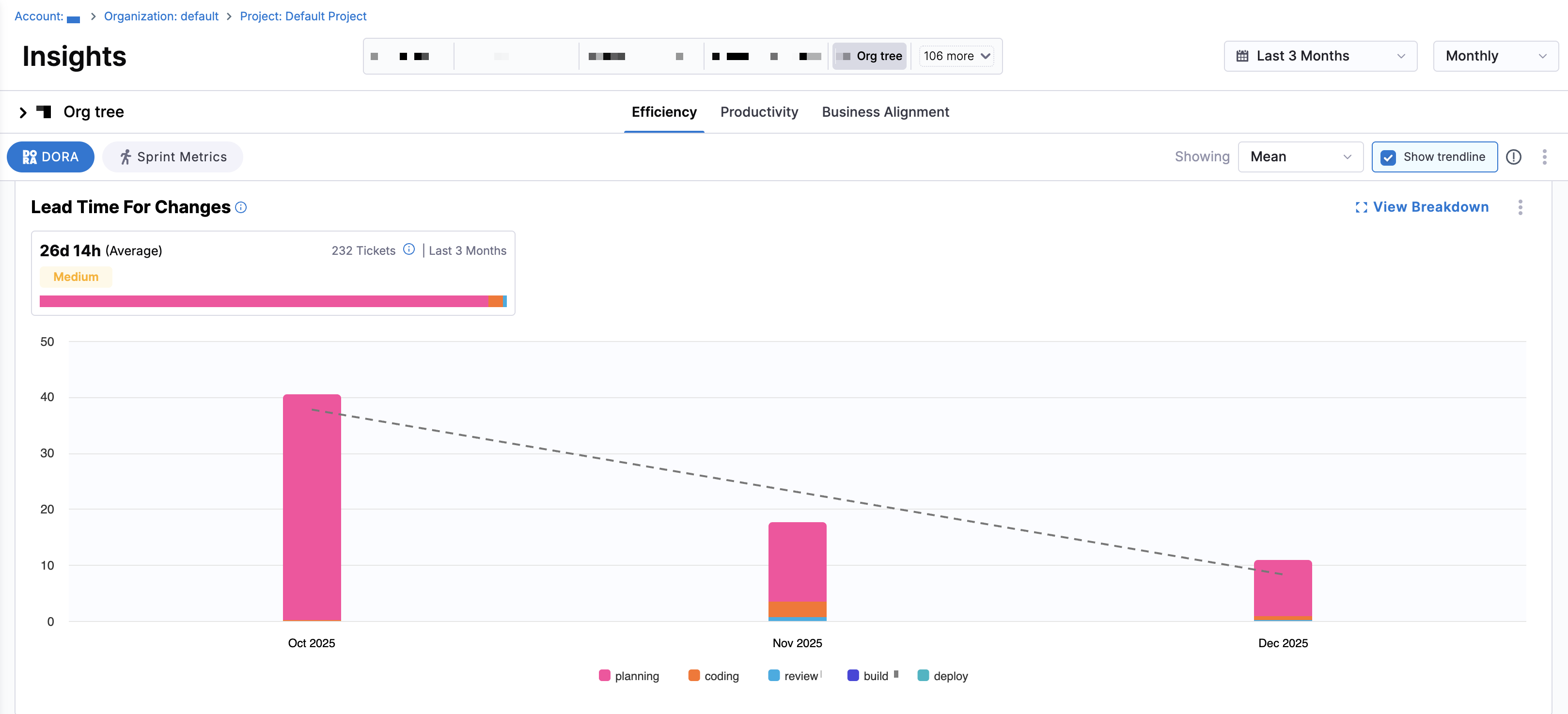 With Sprint Insights, you can configure DORA and sprint metrics in an Efficiency Profile. Sprint configuration includes how sprint work is measured, which sprint metrics are enabled, delivery performance analysis, and sprint boundary grace periods.