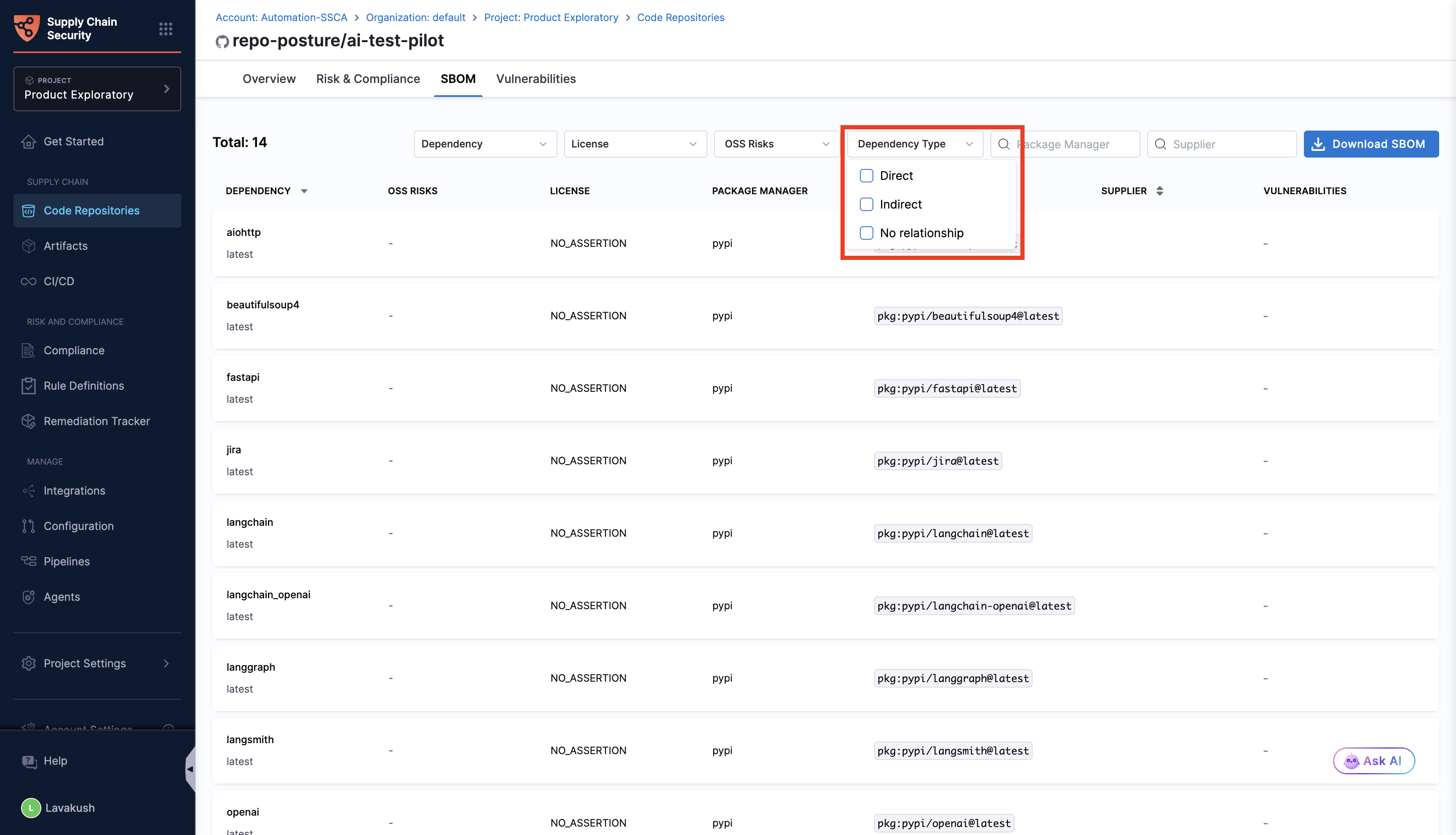 Added support to filter SBOM components by Dependency Type (Direct, Indirect, No Relationship) for code repositories, enabling classification based on how each component is related in the SBOM and improving component-level traceability across the project. This feature is behind the feature flag